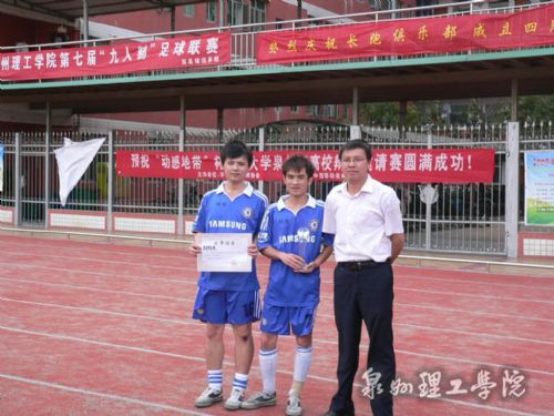 校足球俱乐部指导老师林文艺为获奖球队颁奖 由我校足球俱乐部主办的“理工九人制足球联赛” 在经过长达三周的激烈角逐后,于 5月 6日下午五点在我校大操场圆...