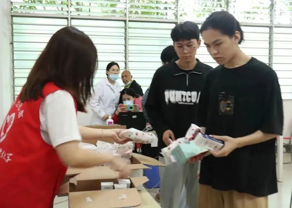 “献血后要补充水分,保持适当的休息,避免做剧烈运动及提重物……”学生志愿者们细心地为同学们讲解献血后的注意事项,同时也充分做好后勤保障工作,维持现场秩序,为成功献血的学子发放糖水、牛奶面包等福利物资。