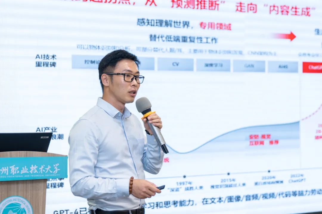 5月7日,泉州职业技术大学举办人工智能学术论坛。论坛主题为“智联世界,创新未来:人工智能的挑战与机遇”,在泉州市中华职教社、晋江市科学技术协会指导下,由泉州职业技术大学承办,泉州市数字经济促进会、泉州市人工智能学会协办。出席论坛的领导、嘉宾有华东师范大学教授周傲英,中国科学院研究员李俊,华侨大学教授柳培忠,华为技术有限公司福建人工智能计算中心COO张欢、泉州市中华职教社副主任卓晨雷、晋江市科学技术协会主席吴清淡,及我校校长吴滨如。论坛由我校副校长郭霏霏主持。