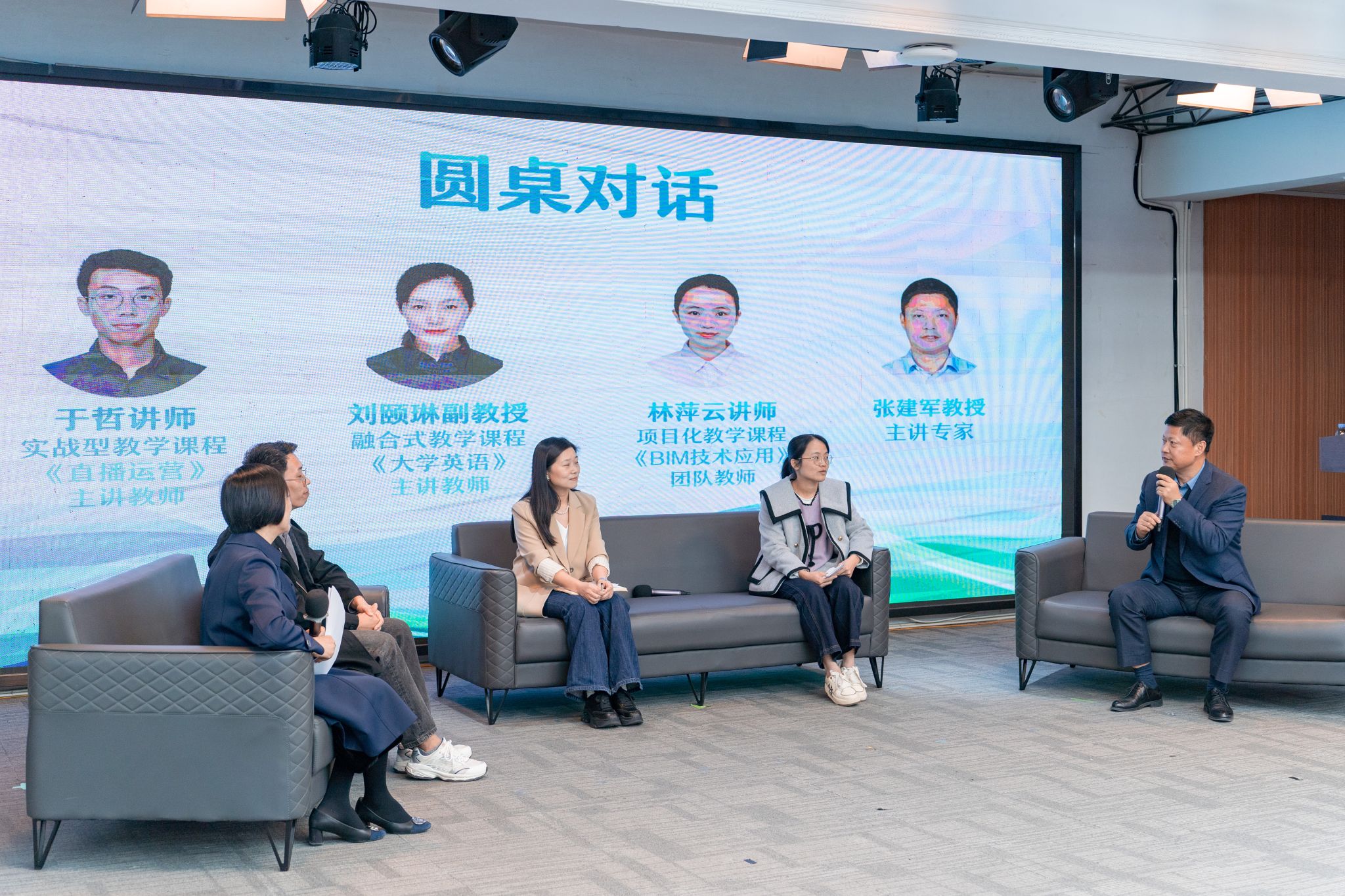 在随后的圆桌对话环节,3位一线教师结合各自课程分享了应用心得。刘颐琳副教授指出,“3C3S”教学法为《大学英语》实现通专融合提供了明确路径,并在与艺术专业的跨学科融合中成效显著;林萍云讲师认为,其“三段式”教学设计有效促进了《BIM技术应用》课程知识的系统整合,推动课堂形态向“以学生为中心、以问题为导向”转变;于哲讲师则表示,该教学法为《直播运营》等源于真实项目的课程提供了理论支撑与系统化构建方法。