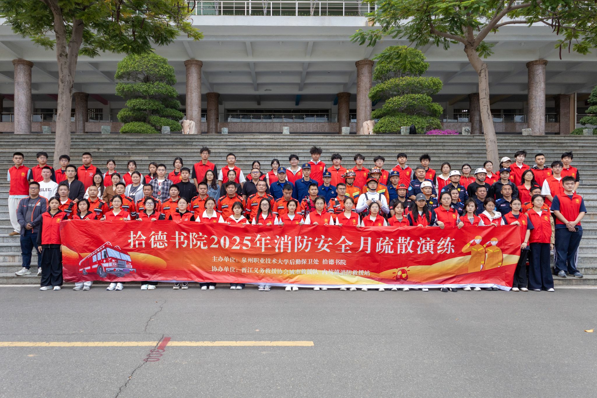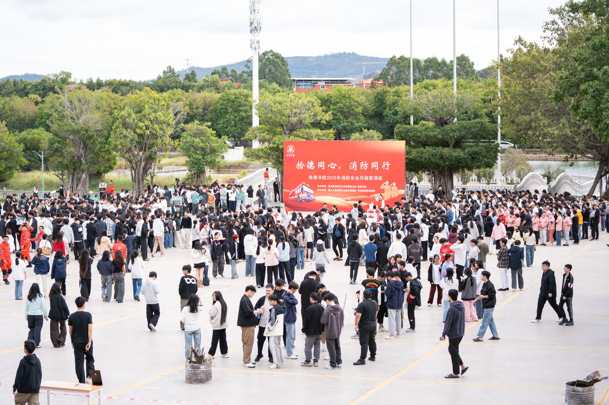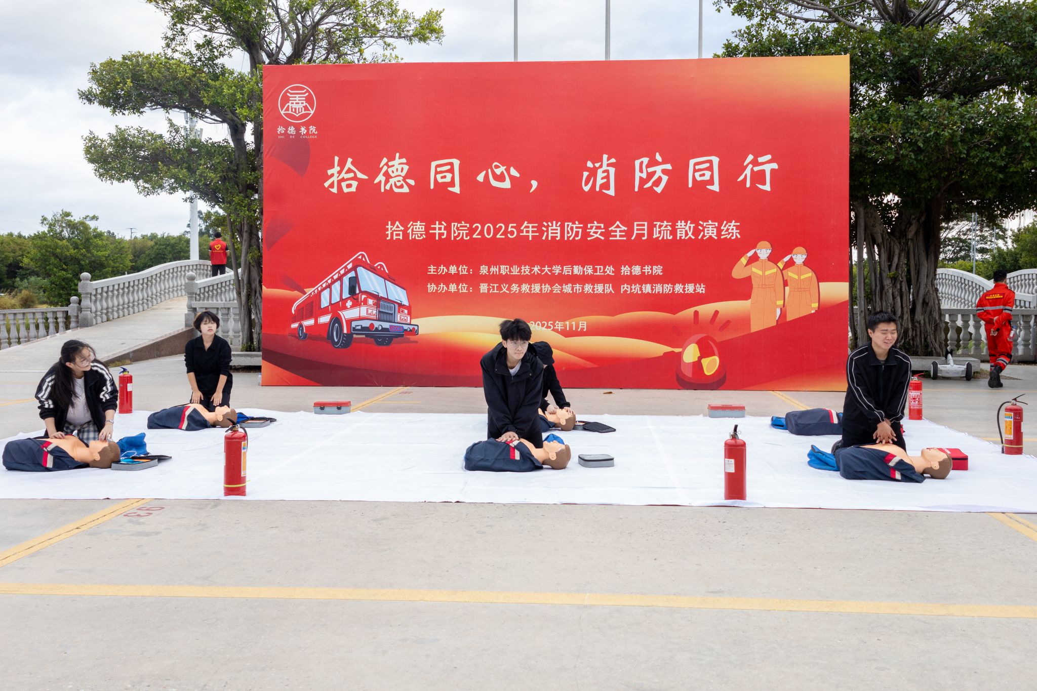 这场由拾德书院联合后勤保卫处、晋江义务救援协会和内坑镇消防救援站共同打造的“拾德同心,消防同行”主题活动,将传统的消防演练升级为一场集知识性、趣味性、体验性于一体的安全实践课。