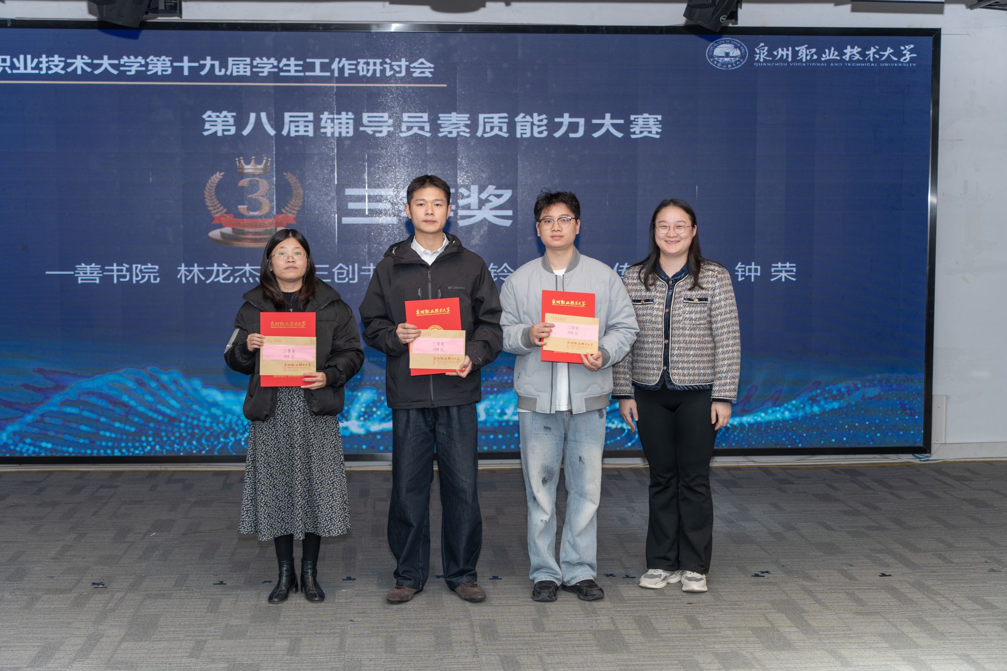 12月24日,迎来了研讨会的成果汇报及专项表彰。校党委书记傅志雄,校党委副书记、副校长蔡金佩,校工会主席陈其生,人事处、学工处、校团委负责人,各学院、书院主要负责人及全体辅导员、班主任参会。会议由学工处副处长朱冰梅主持。