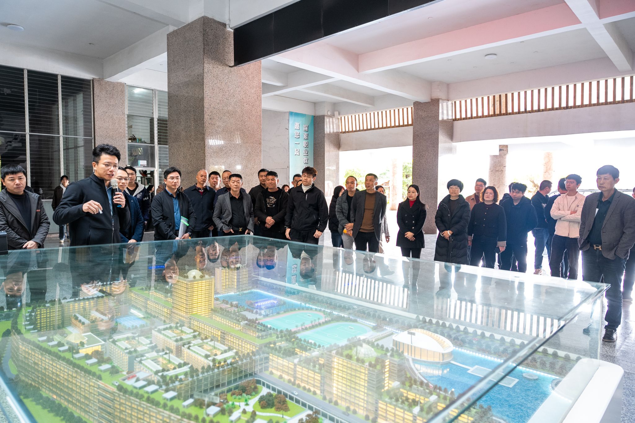 会前,与会人员参观了生态校园沙盘、艺术设计展厅、电商直播基地、数智产教融合展厅等教学科研场所。