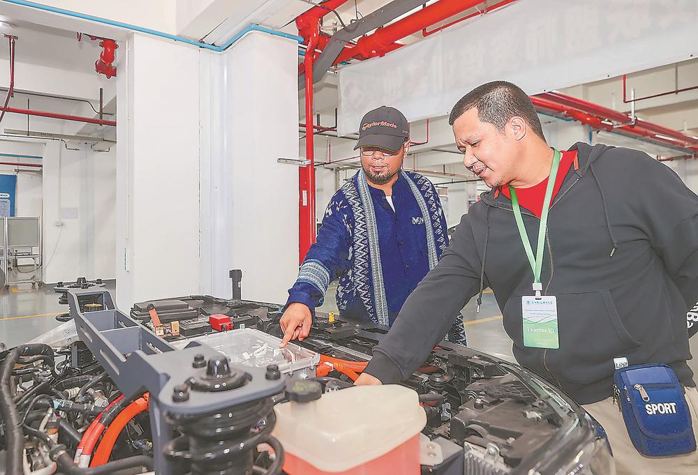 中泰教师交流新能源汽车相关技术细节。本报通讯员 董严军 摄