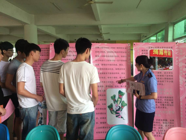 据悉,此次晋江市市场监督管理局一行8人通过宣传展板、分发材料的形式为我校大学生讲解传销相关知识,让学生通过案例辨别传销的危害,倡议大家远离传销,共创和谐,在场的学生进行深入的学习,通过交流并与工作人员进行互动,活动取得了良好的效果。