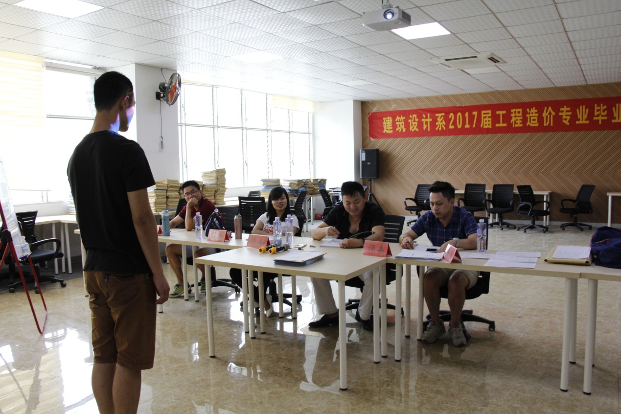 年8月28日至8月31日,建筑设计系工程造价专业14级毕业生设计答辩会在主楼第二会议室举行。担任此次答辩会的评委老师分别是建筑系主任吴铭辉老师、工造专业教研室主任毕业设计指导老师曹树明老师、金少春