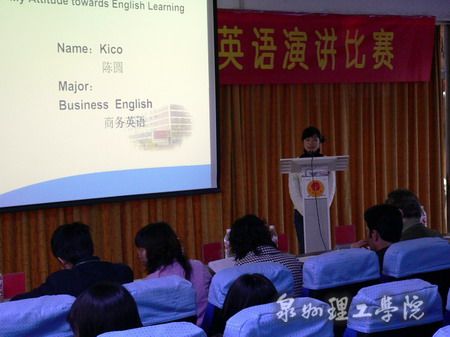 由外语系和英语协会主办的泉州理工学院第五届大学生英语演讲比赛决赛4月4日下午在校学术报告厅举行。10位从预赛中脱颖而出的选手,经过演讲、回答提问等环节的比赛,最终决出如下名次:05英语(3)班的吴金凤同学获一等奖、最佳语音奖、最佳台风奖;05英语(2)班的陈冬梅获二等奖;05英语(1)班的罗舒琳获得三等奖。